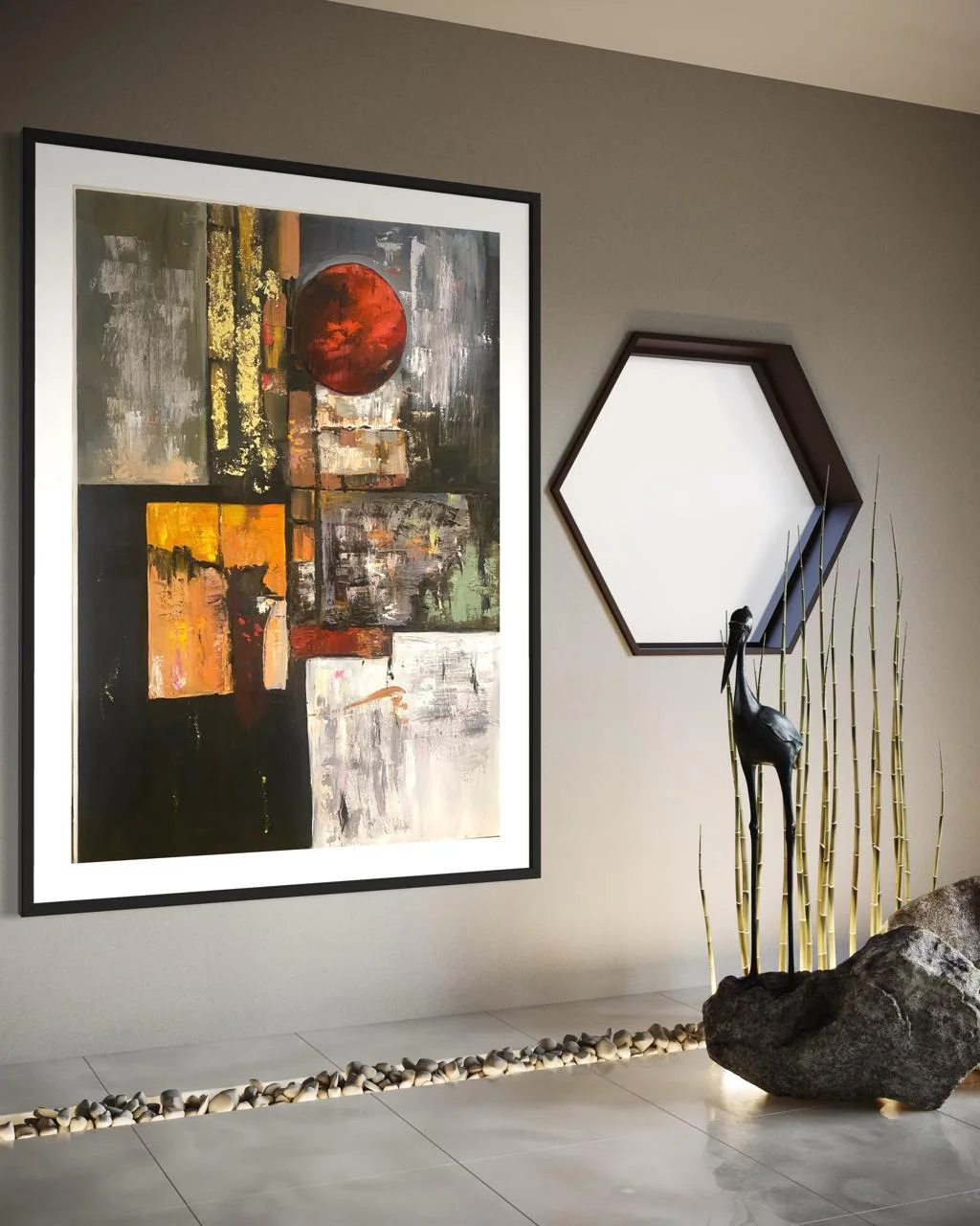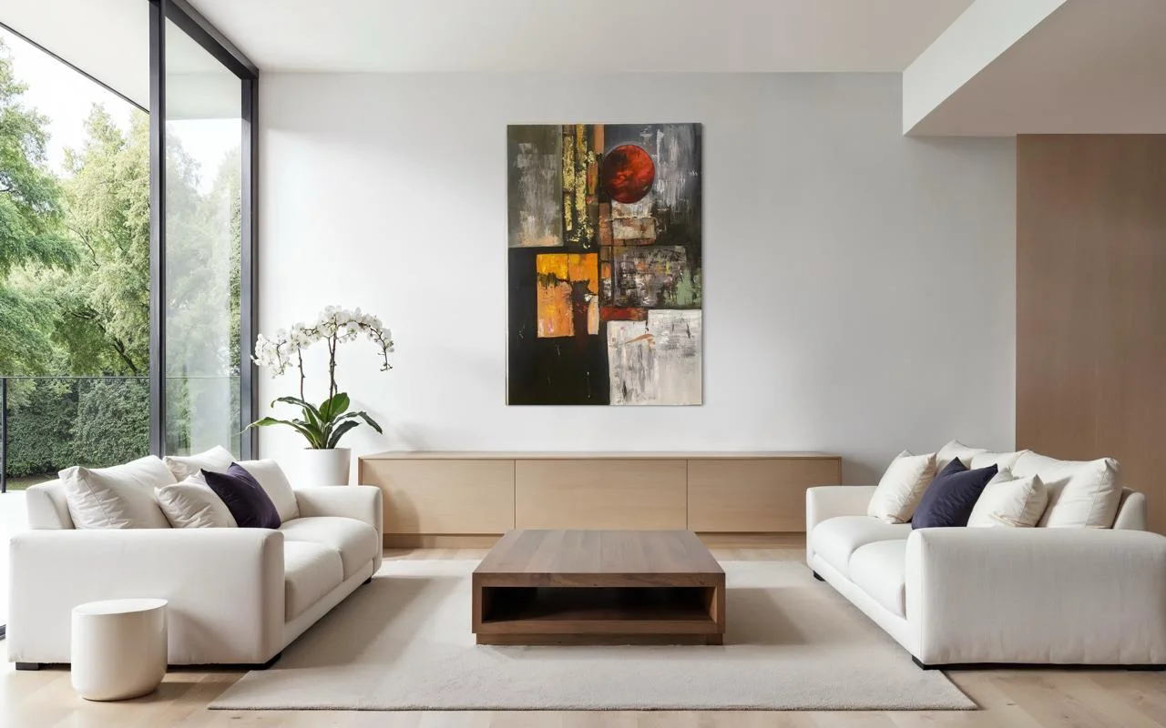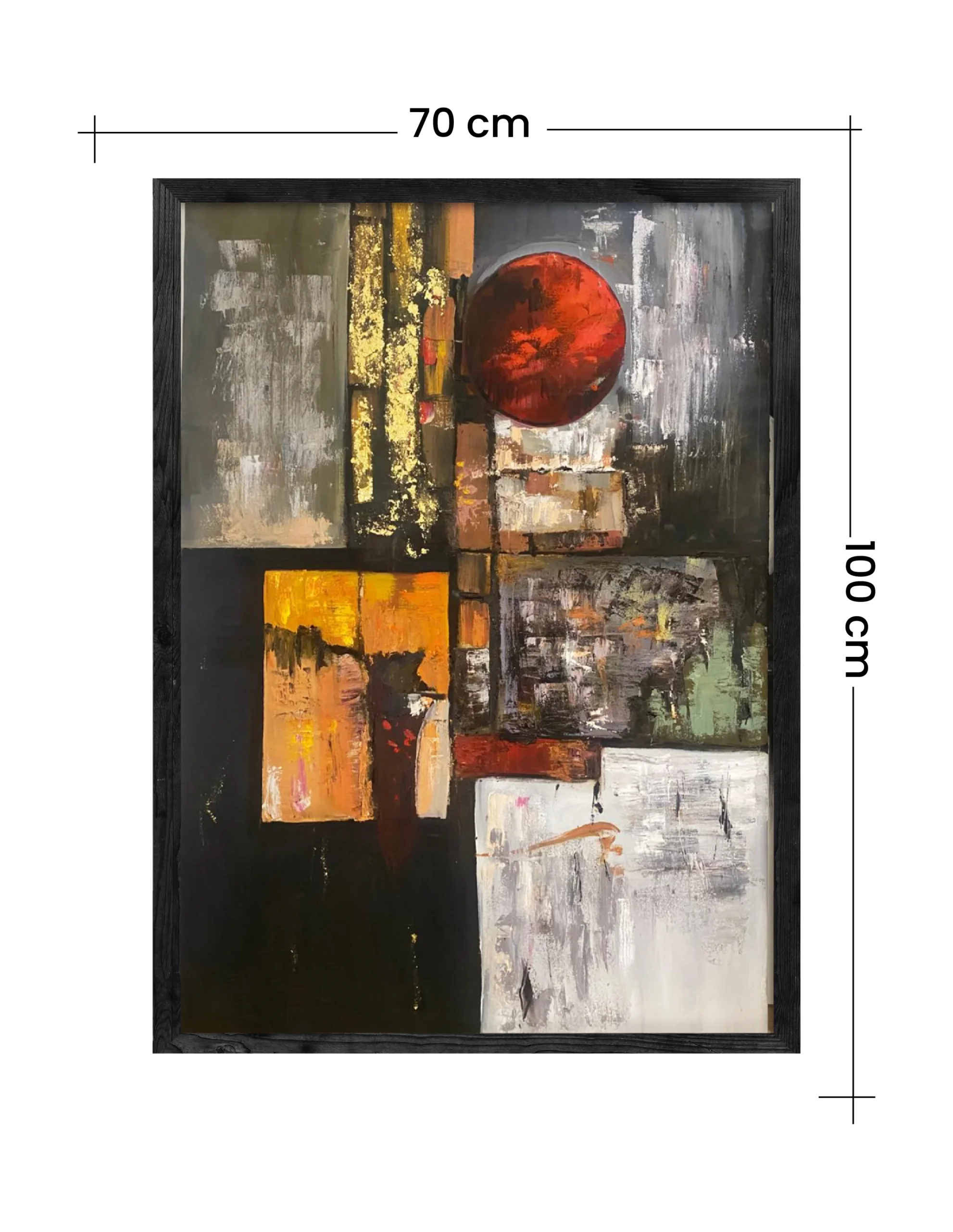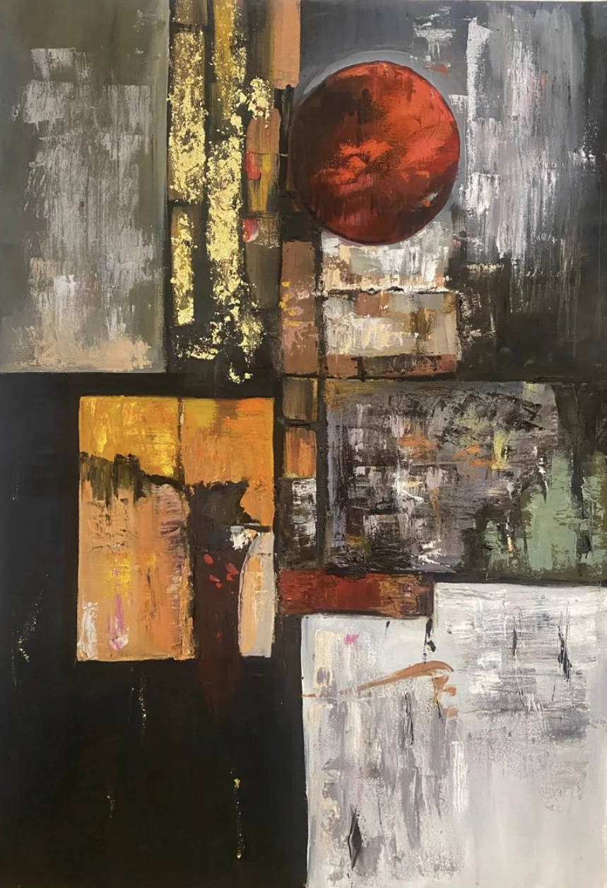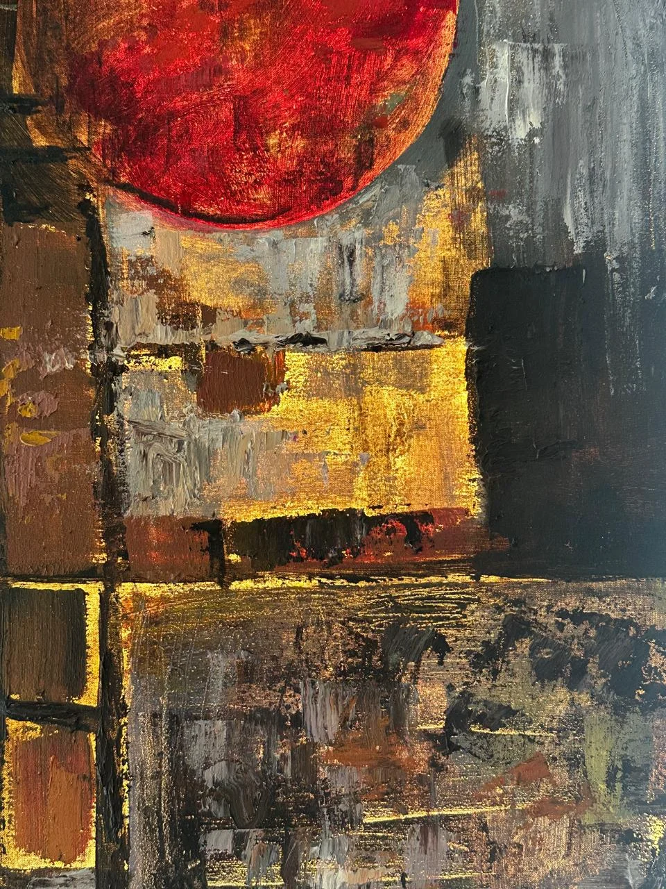 A handmade abstract oil painting featuring a bold red circle and rich textured layers. Deep, dramatic, and full of mystery — perfect for modern, expressive spaces.