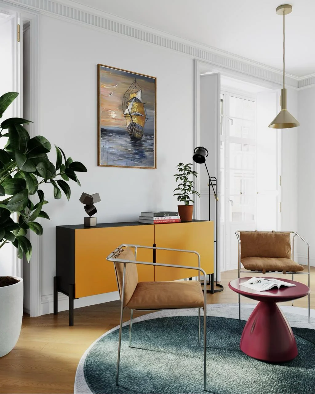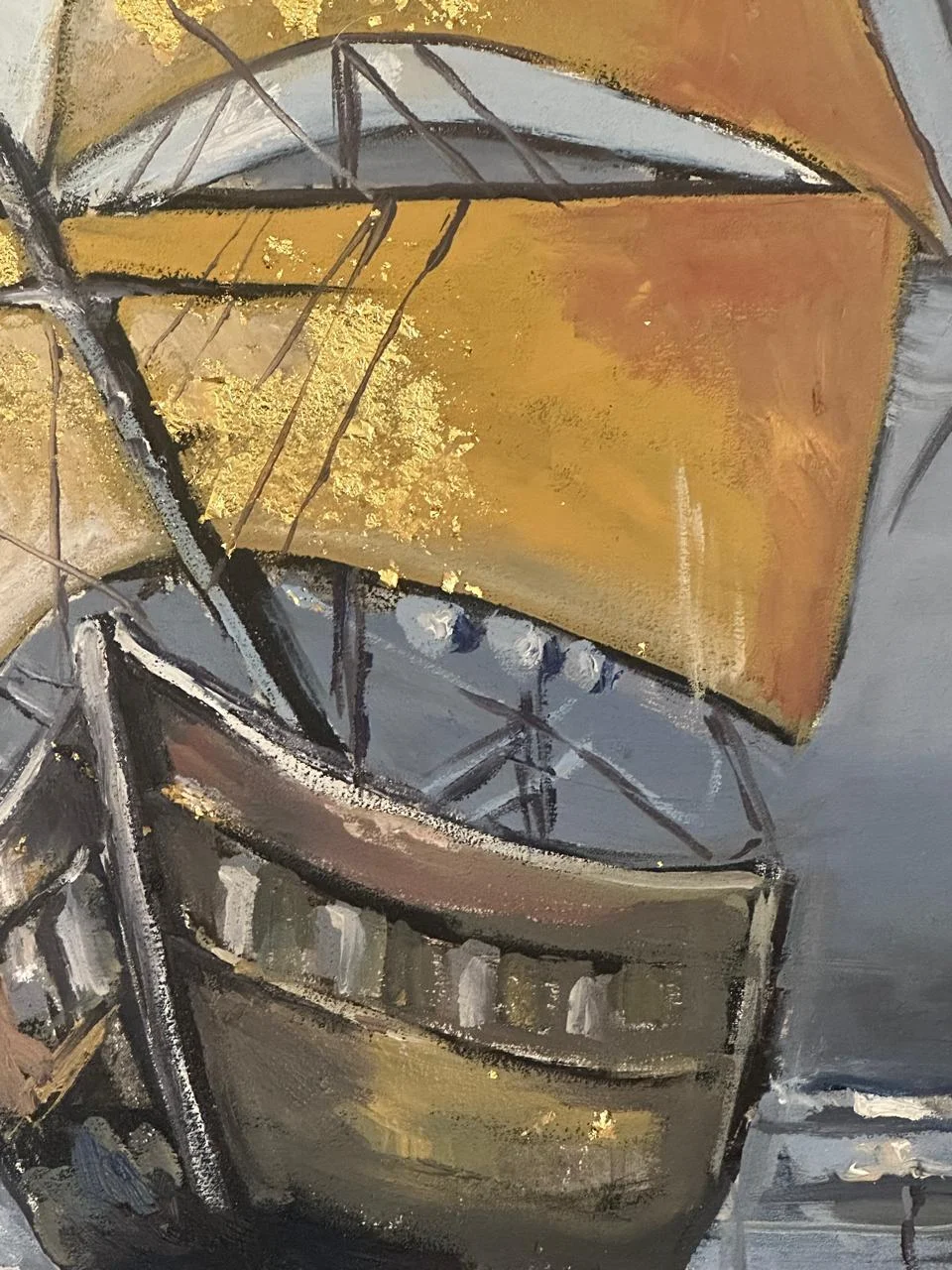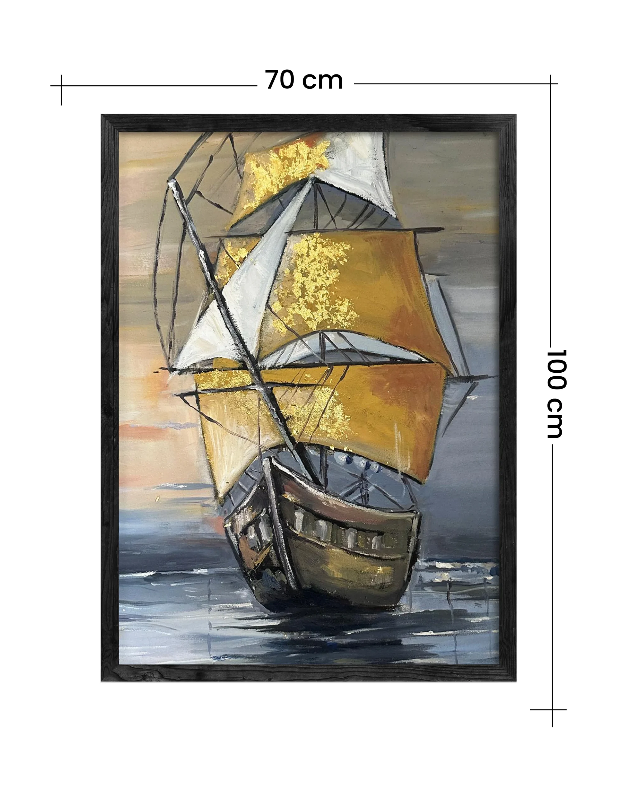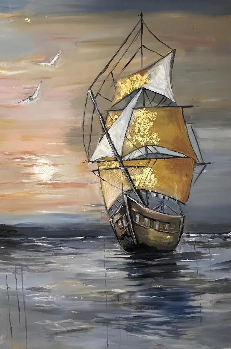 A handmade oil painting capturing a majestic ship with golden sails gliding into the sunset — textured, timeless, and crafted to elevate your space with warmth and wonder