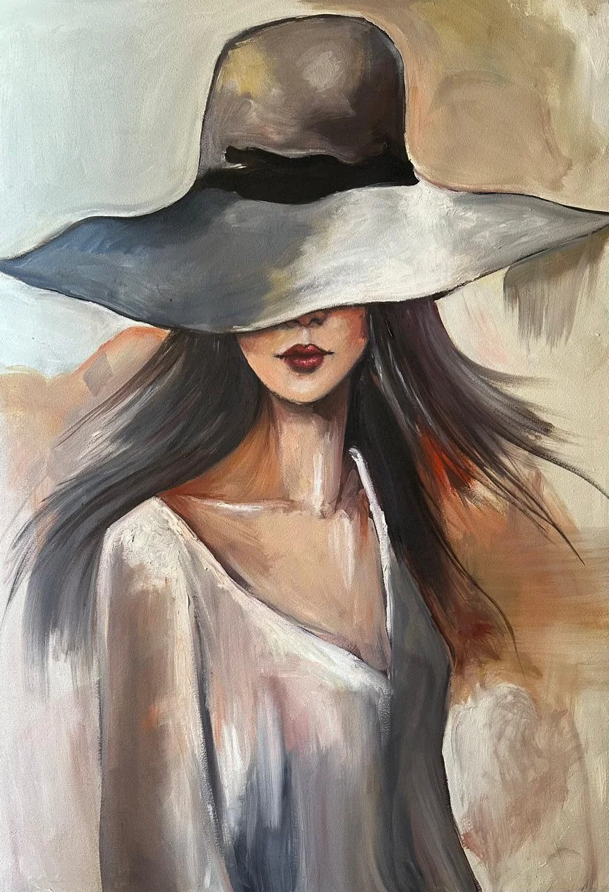 A handmade oil painting of a graceful woman, her face hidden beneath a wide hat — soft strokes, flowing tones, and timeless mystery wrapped in quiet elegance.EGP4,500