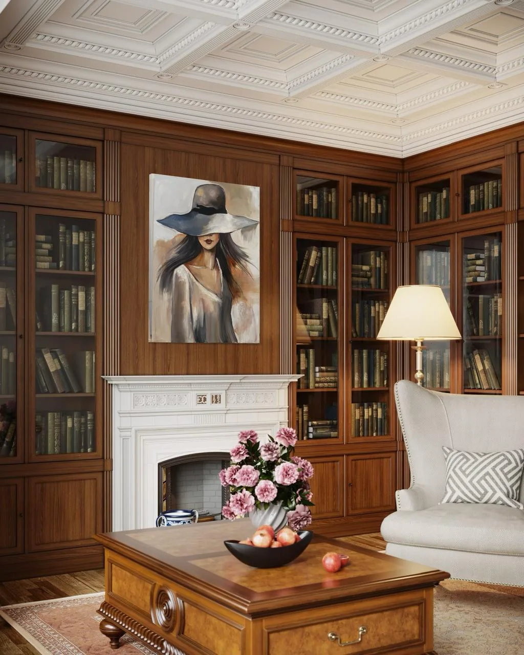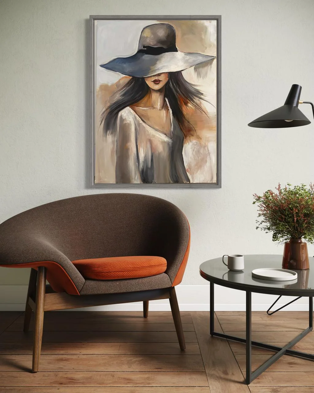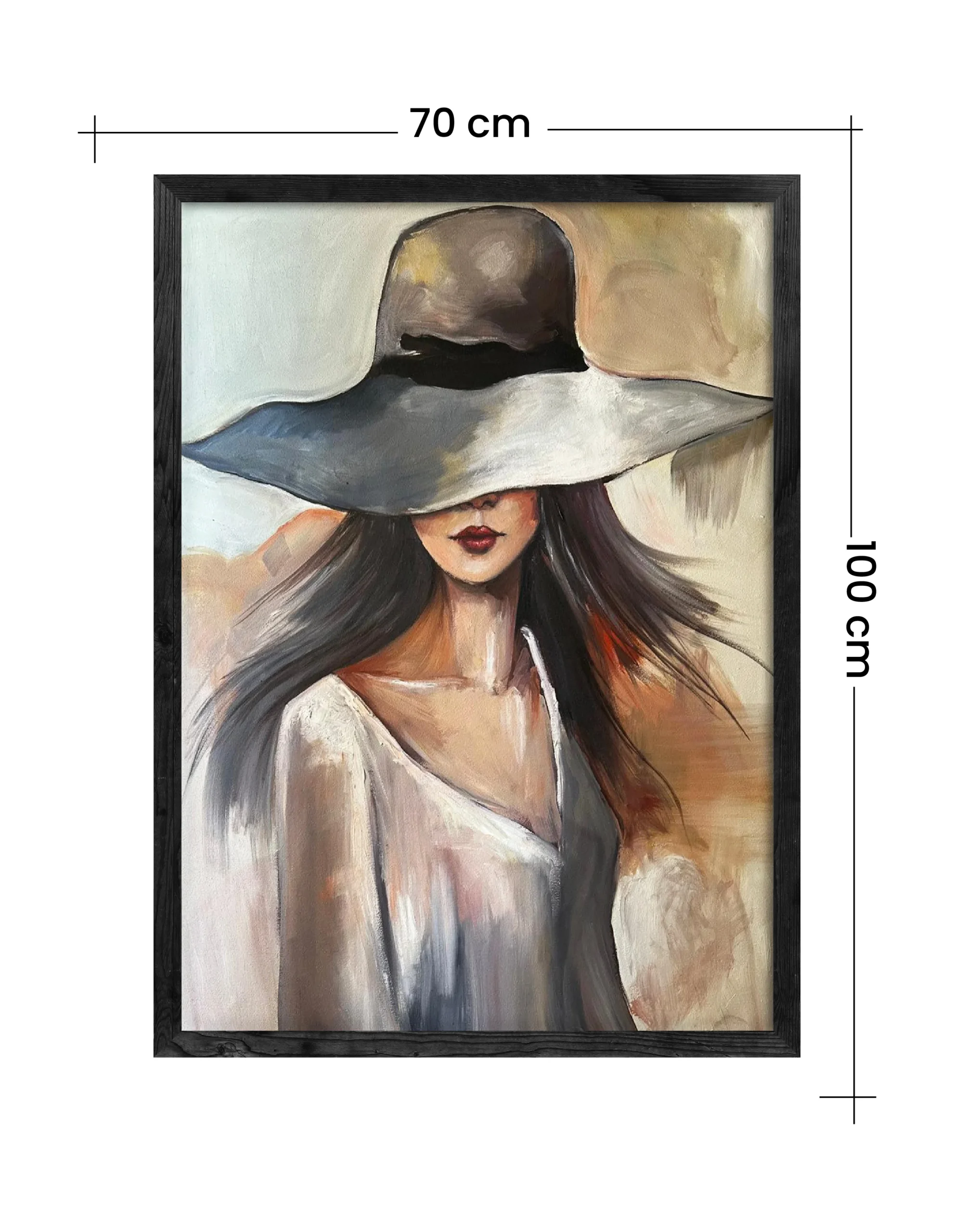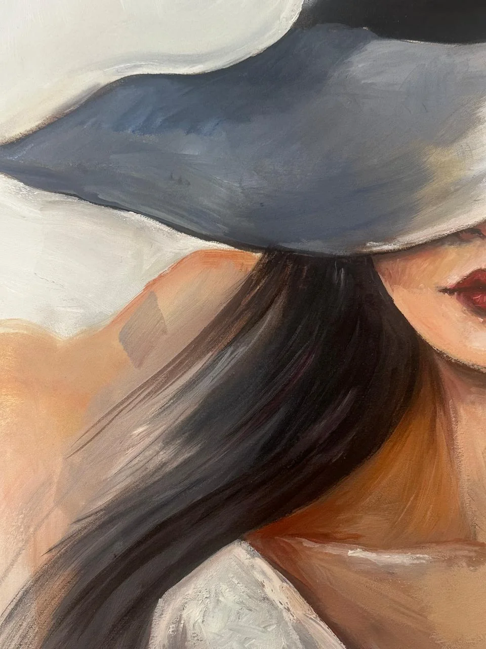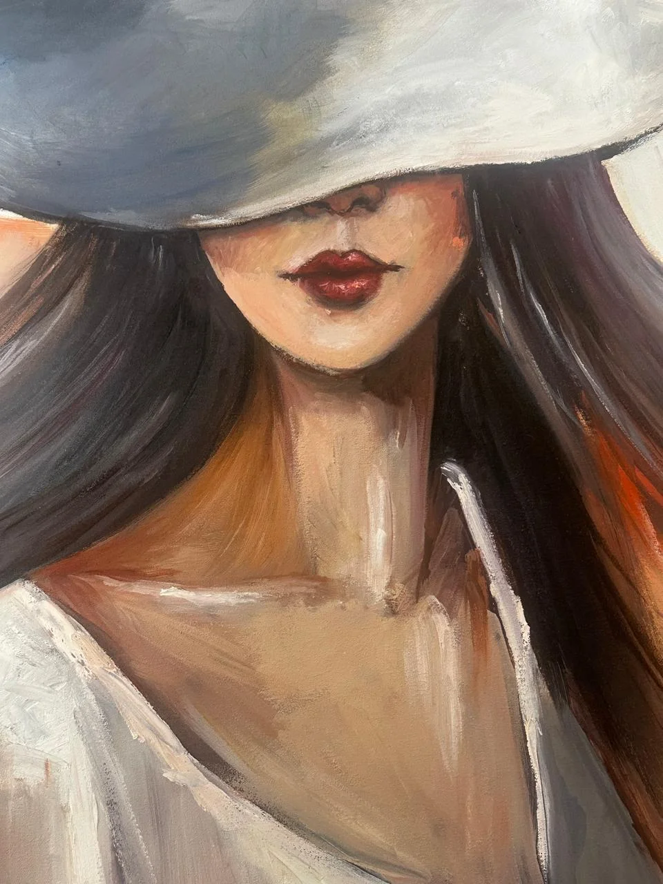 A handmade oil painting of a graceful woman, her face hidden beneath a wide hat — soft strokes, flowing tones, and timeless mystery wrapped in quiet elegance.