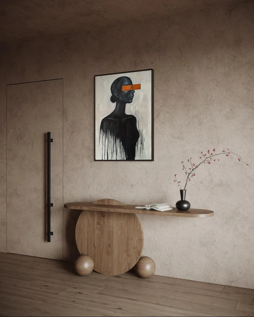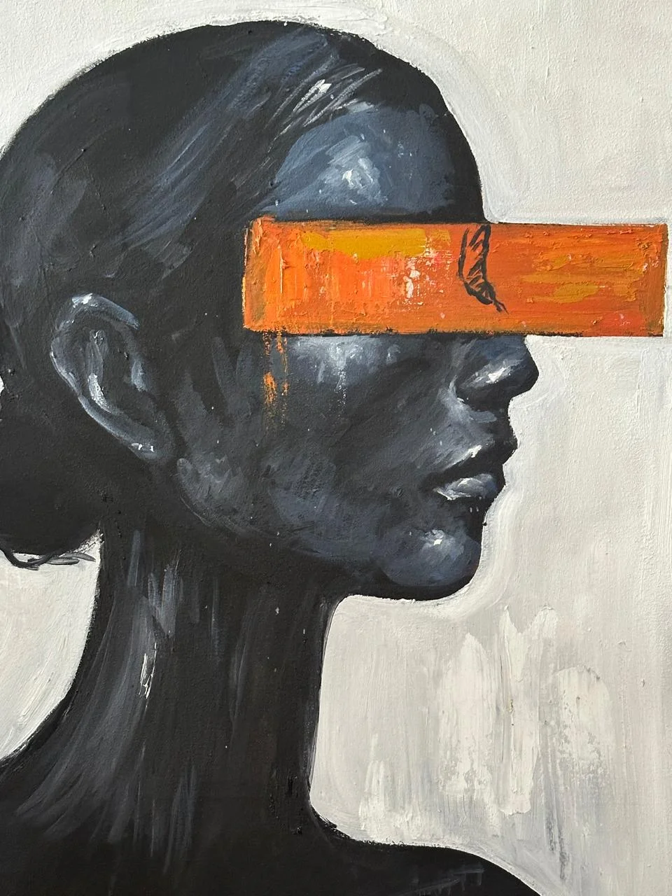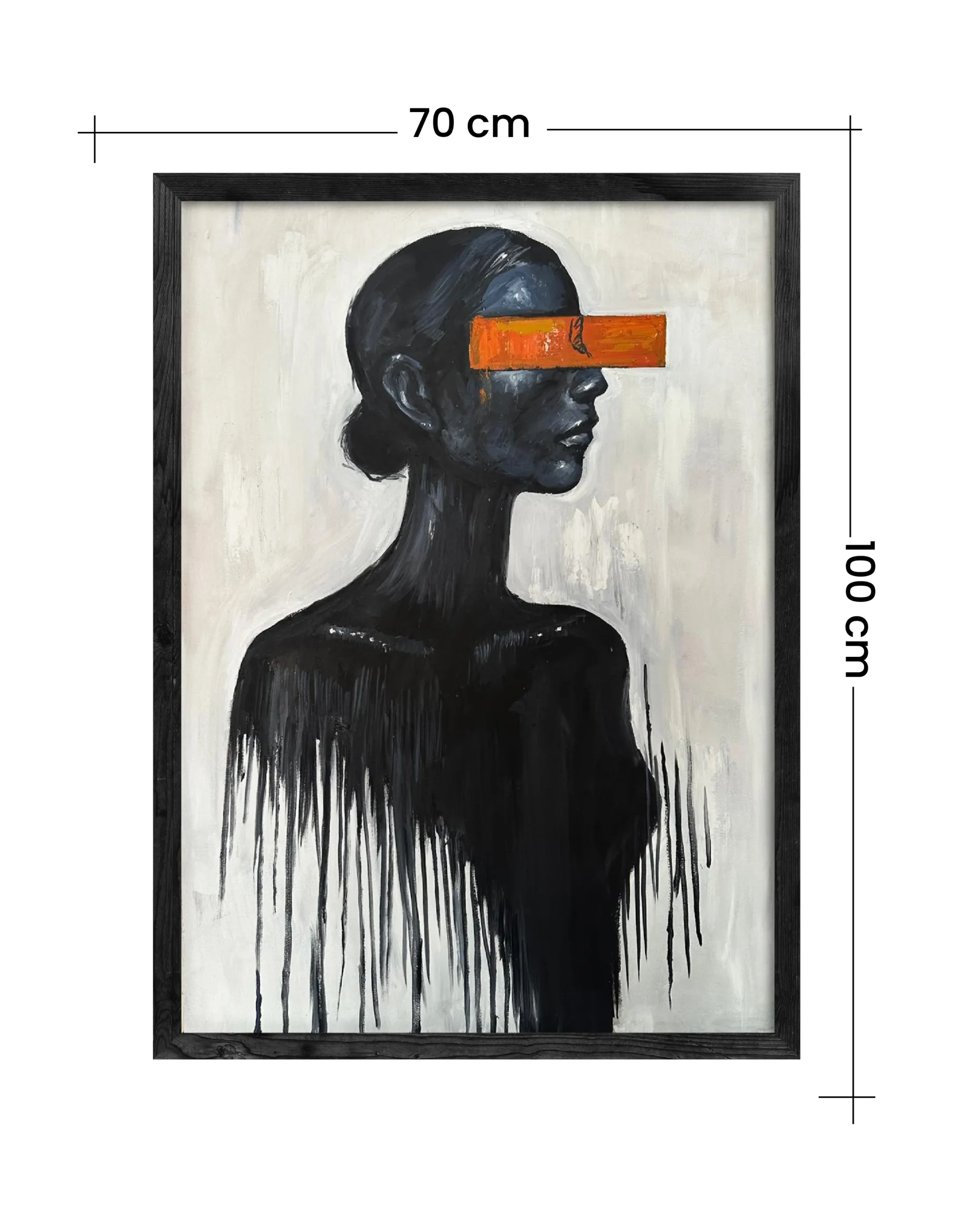 This handmade oil painting shows a dark, mysterious woman with an orange band covering her eyes. The dripping effect adds emotion and depth, making it a powerful and modern piece of art.
