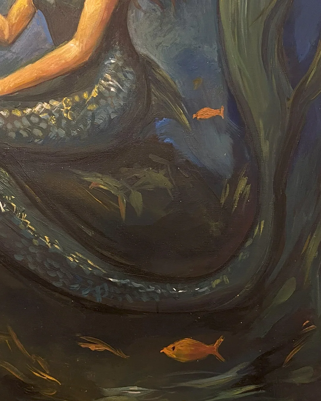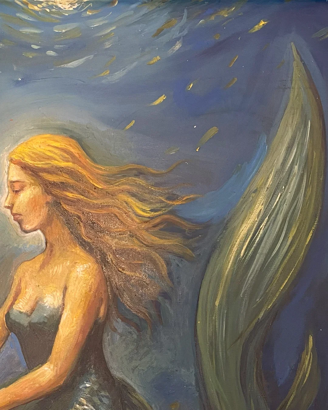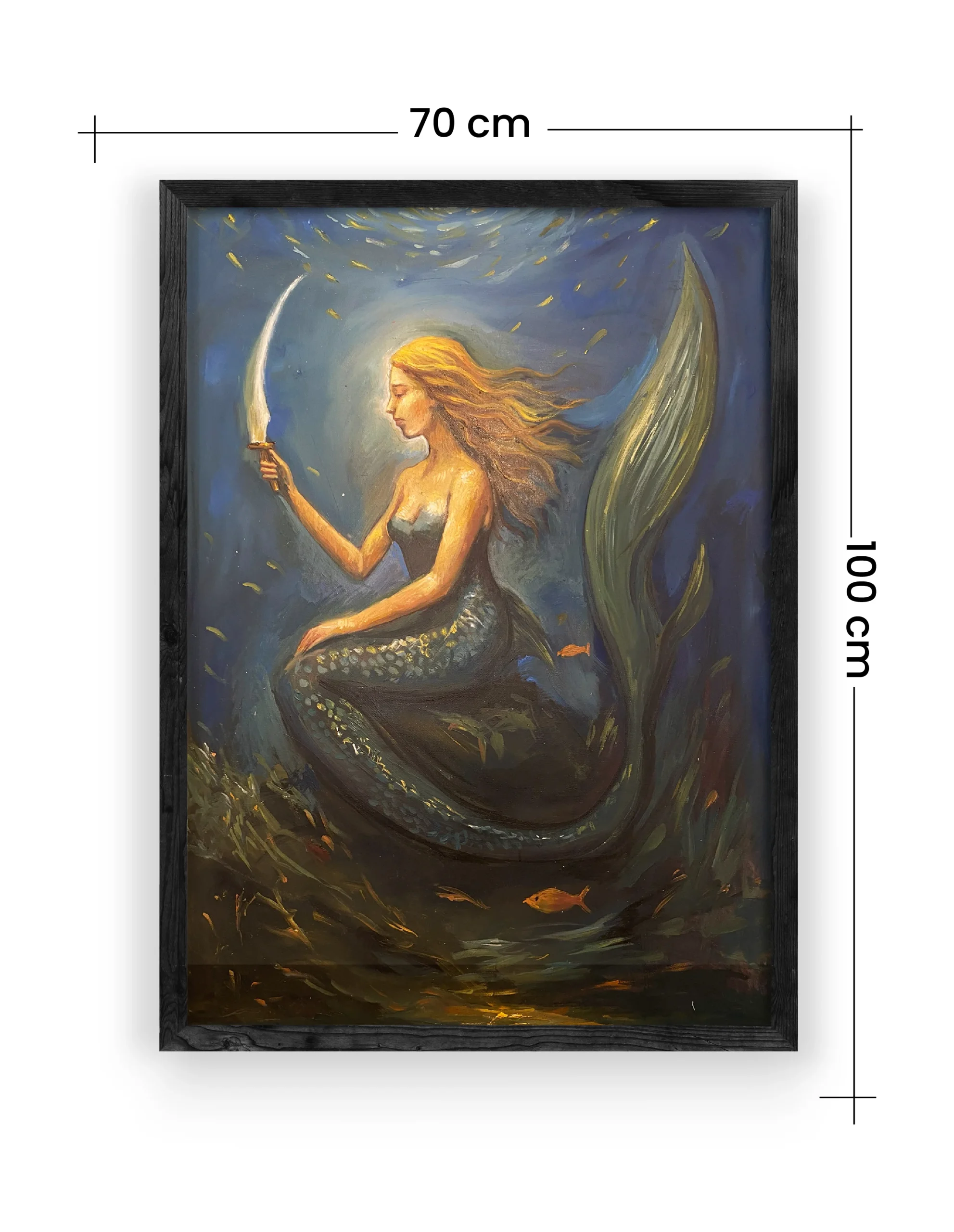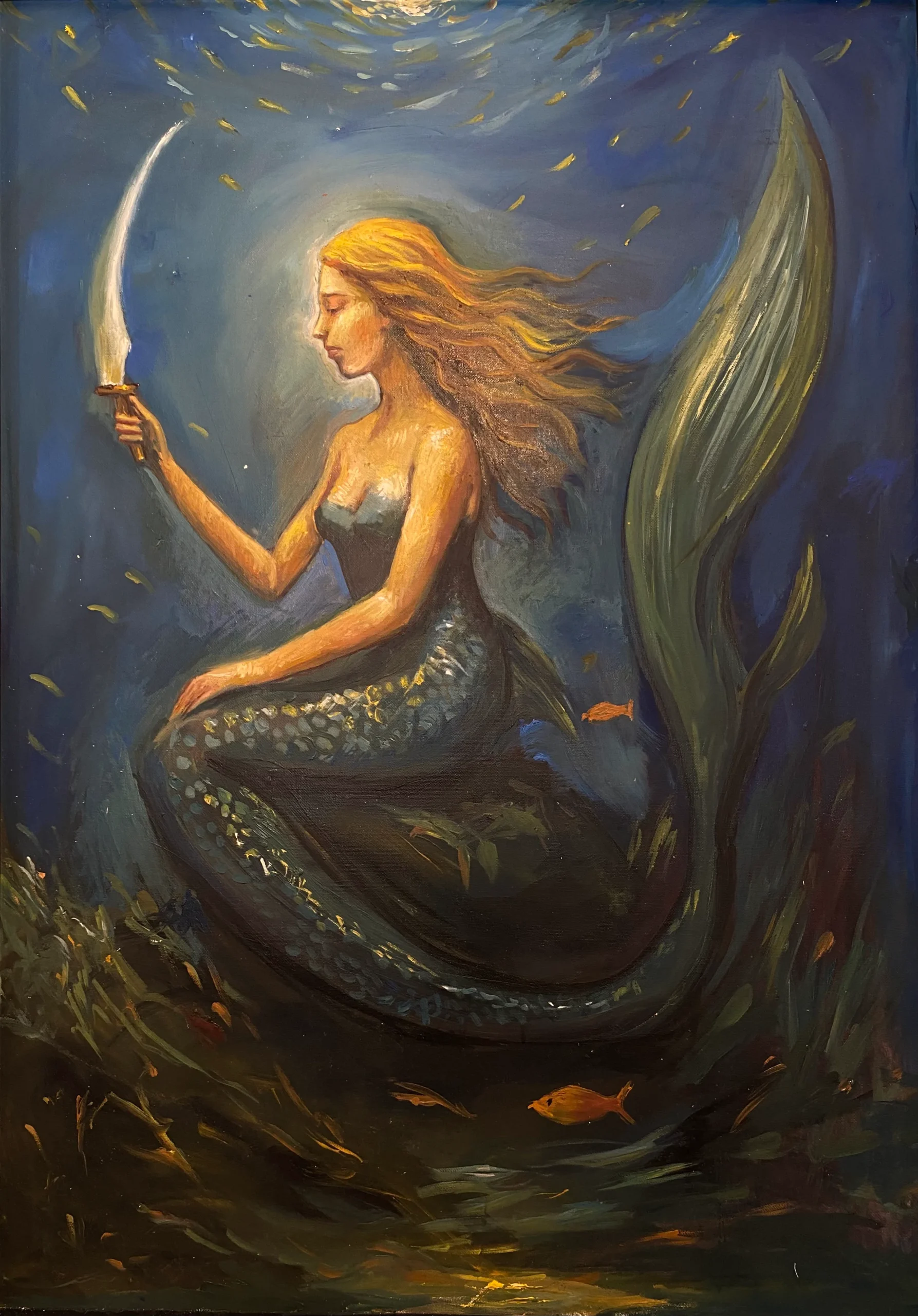 This captivating portrait portrays a serene mermaid, her golden hair flowing gracefully as she holds a glowing, curved blade beneath the ocean’s surface. Bathed in the soft light of the moon above, she embodies both beauty and strength, guarding the mysteries of the deep sea. The gentle movement of the underwater flora and the vibrant fish around her add to the enchanting, dreamlike atmosphere of this underwater world.
