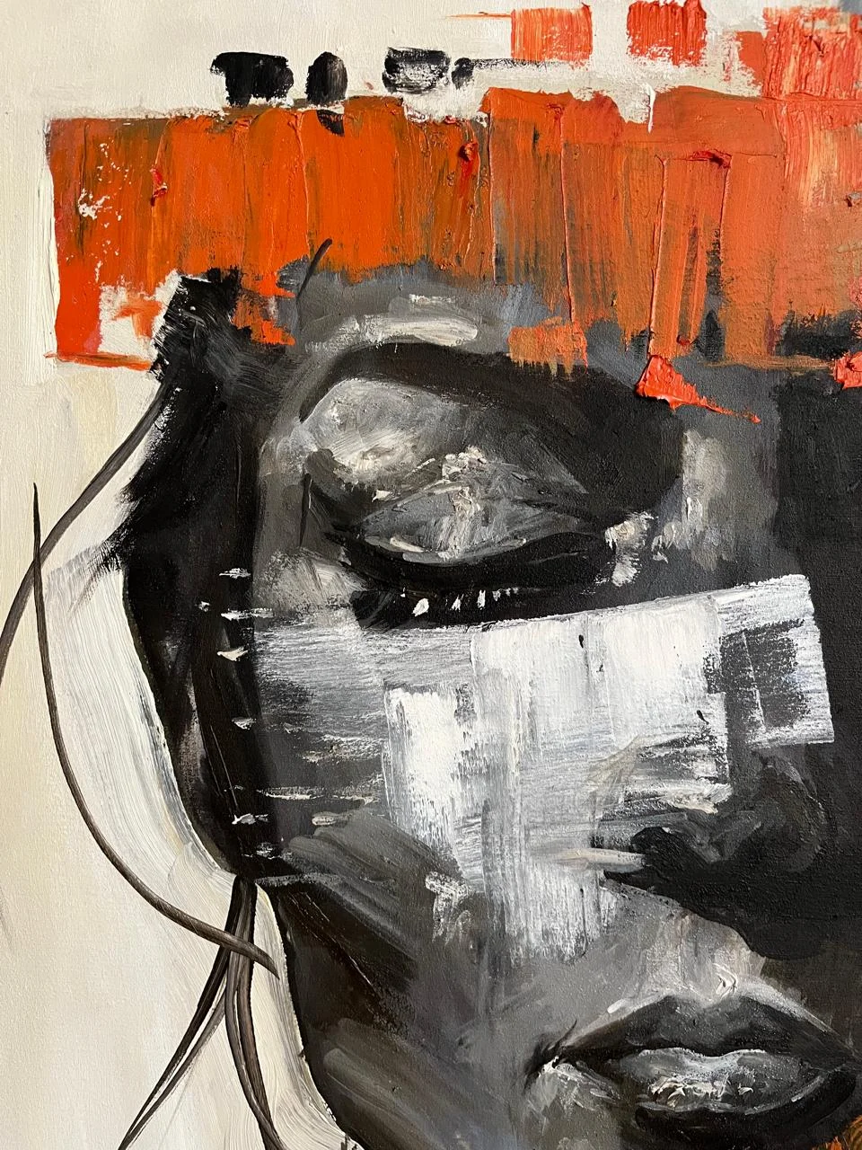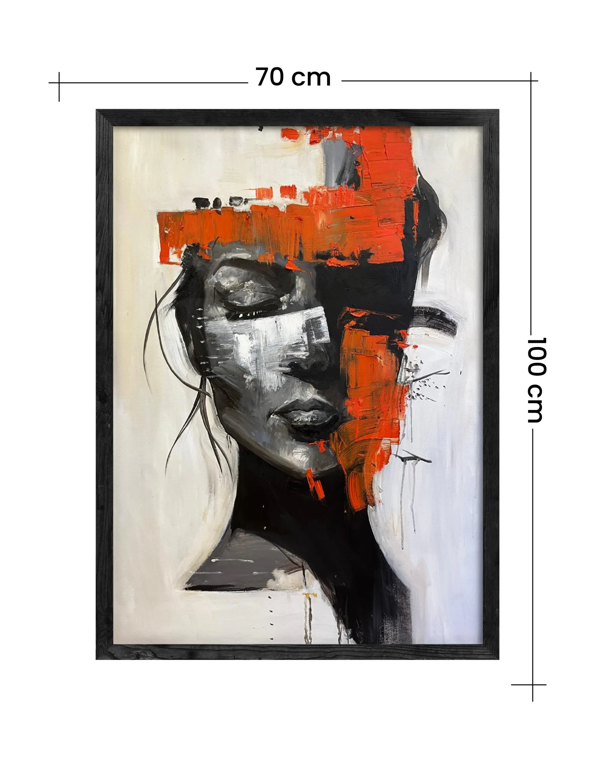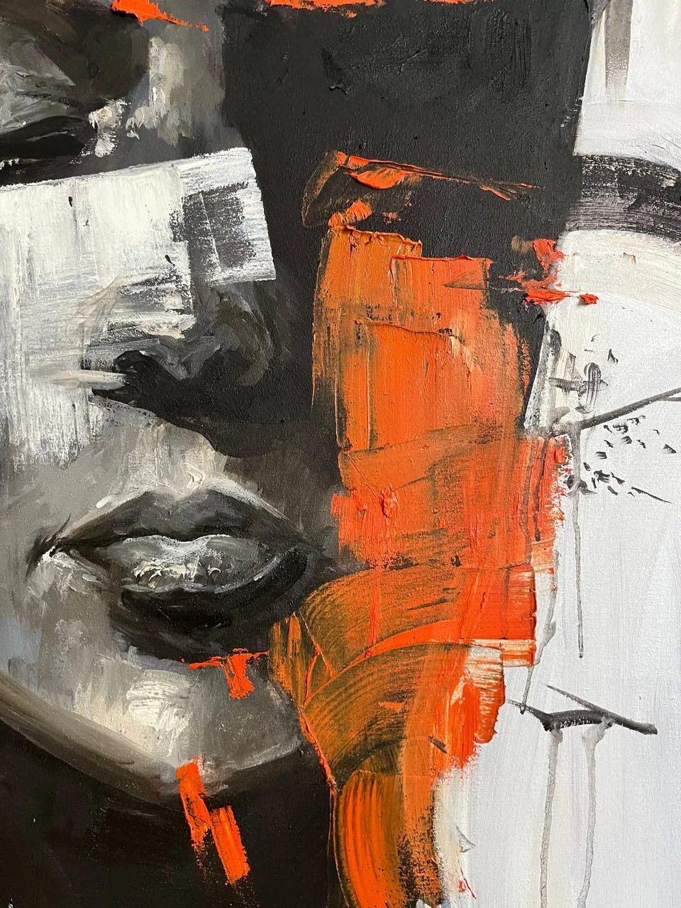 A handmade oil painting that reveals the beauty in brokenness. Vivid orange strokes slice through a monochrome portrait, capturing the tension between vulnerability and resilience. Bold, emotional, and deeply human.